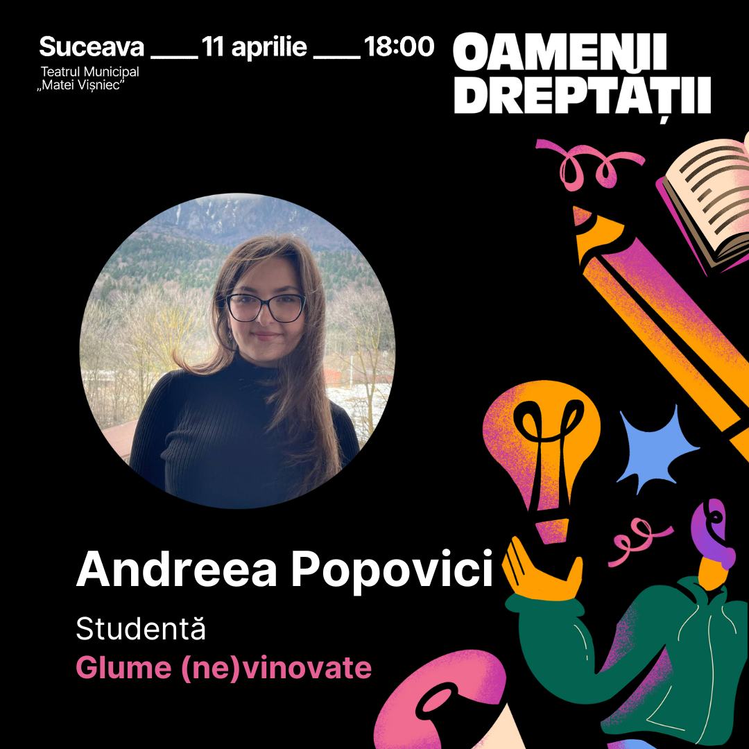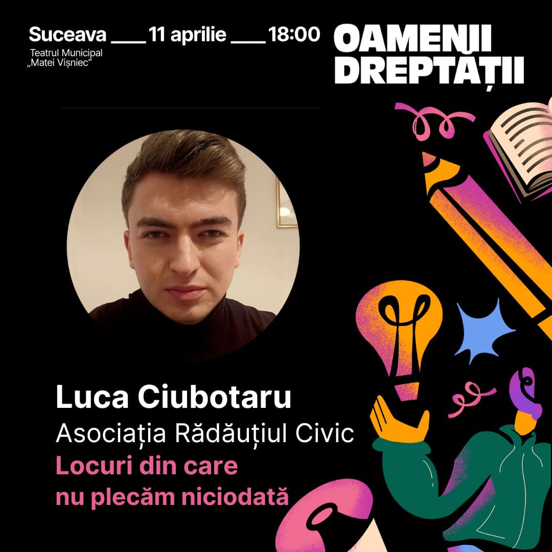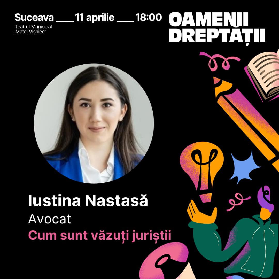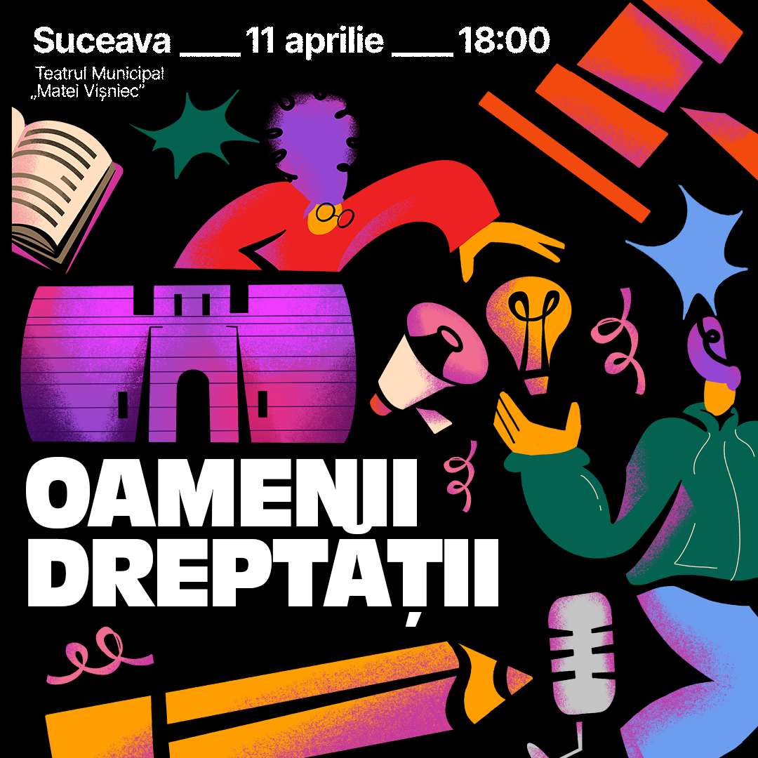 Pe 11 aprilie de la ora 18:00 spectacolul Oamenii Dreptății are loc la Teatrul „Matei Vișniec” Suceava - un show cu povești autentice, teatru, muzică și poezie, despre ce și cine mișcă lumea! Vor urca pe scenă profesioniști din justiție, jurnaliști, pompieri, antreprenori, profesioniști din sectorul ONG, studenți și artiști.
